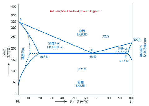 狀域,而ABD曲線則表示液相線。固相線液相線兩線會合點,C點是為共晶點。其時,錫鉛含量為63/37。